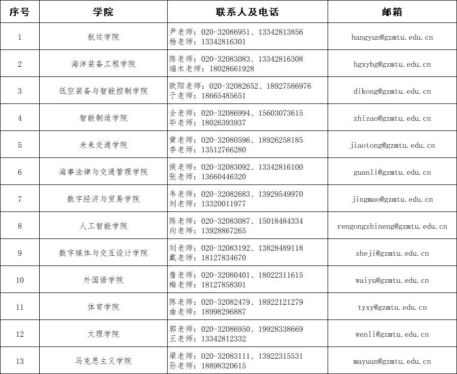 (三)各二级学院咨询联系方式如下表: